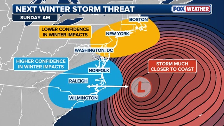 There is higher confidence that coastal areas of South Carolina, North Carolina and Virginia see winter impacts as low pressure area forms on the Southeast coast. (FOX Weather)