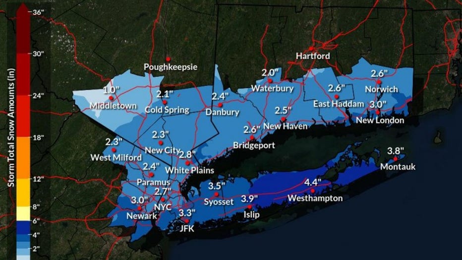 Parts of New York City, Long Island and New Jersey could see up to 4 inches of snow, according to the National Weather Service.