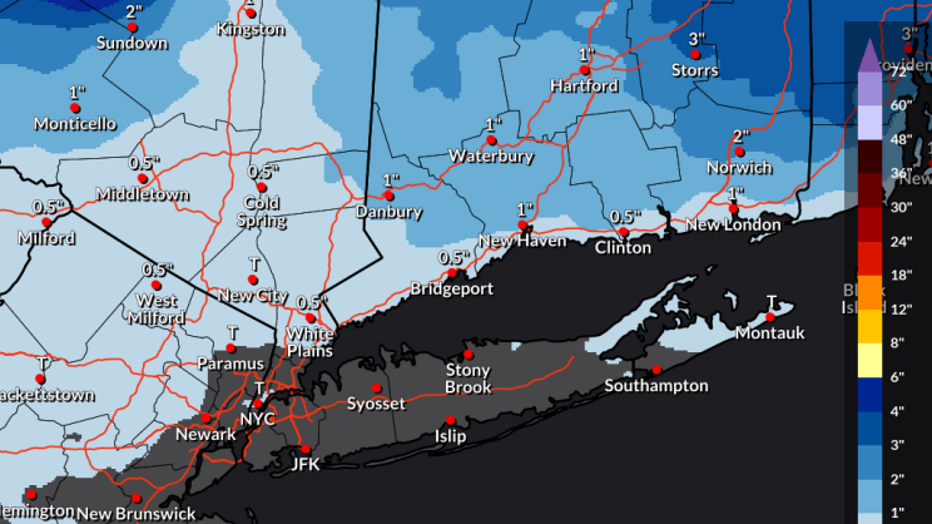 Parts of northern and western New Jersey and interior Connecticut have a higher chance of seeing light snow or ice, particularly away from the immediate coast.