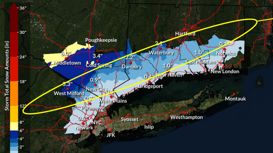 A map from the latest NWS briefing highlighted a corridor from northern New Jersey through the Hudson Valley and into interior Connecticut with the greatest potential for several inches of snow before the changeover.