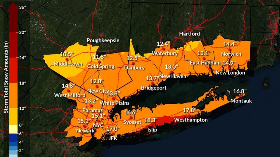 - NYC, Long Island, coastal CT: 13–18 inches likely, with locally higher amounts possible